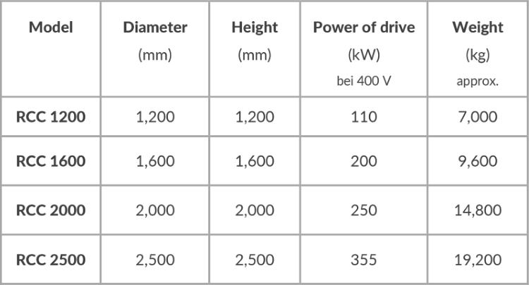The throughput depends on the purpose and setting of the RCC. We offer the RCC as single machine with drive and base frame and without or with the necessary control system or as a complete system.
