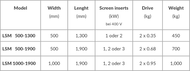The LSM can be equipped with three stacked screen inserts resulting in four screen cuts. A wide range of different screen inserts are available.